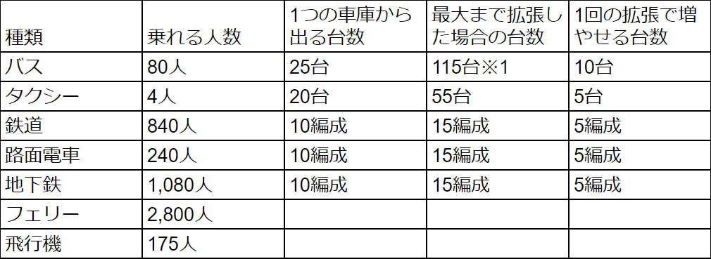乗り物の種類ごとの乗れる人数と車庫のまとめです。