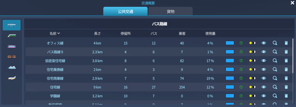 こんな感じです!使用率が書いていて、0%に近い場合は車両の数や路線自体を見直した方がよさそうです。
