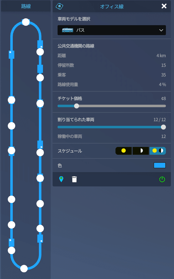 左側の丸いのが停留所、四角いのが車両で、車両の中にある白い丸は容量の使用量を6段階で表示されています。