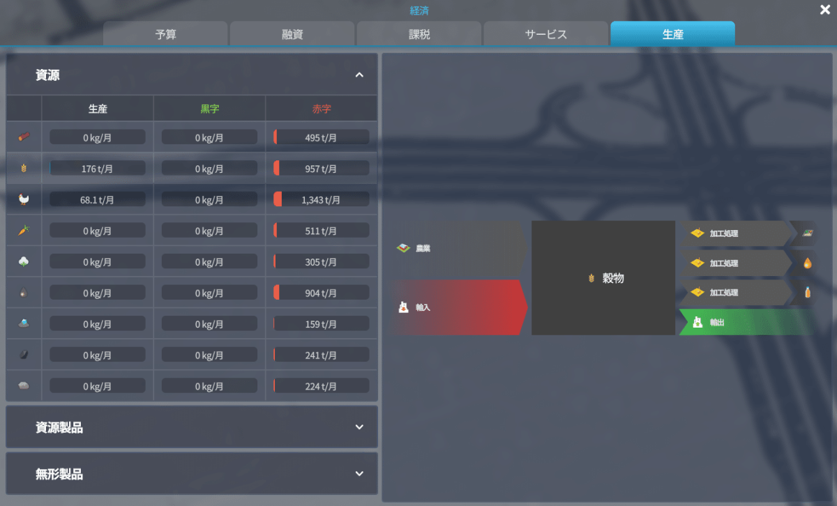 外部との取引でも紹介しましたが今作は生産というものがあって、どれぐらい生産しているのかそれを外部に販売していれば黒字になって輸入している場合は赤字になります。