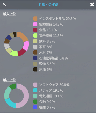 ここでは何を街で生産しているか、なにを輸入、輸出しているのかが見れます。